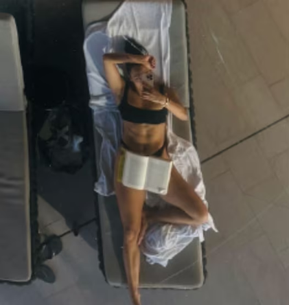 Auf dem Bild liegt Amira Aly entspannt auf einer Liege, ein Buch in der Hand, die Beine locker überschlagen. Der Blick in den Spiegel an der Decke zeigt, was sofort ins Auge fällt: Ihr definierter Waschbrettbauch und die athletische Silhouette. Offensichtlich steckt viel Training hinter dieser Top-Form – und ihre Follower sind beeindruckt.