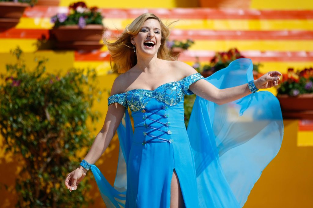 Die Farbe, die der Sängerin grundsätzlich gut steht, war einfach zu dominant vertreten und von ihrer schönen Figur war auf Grund der vielen Schichten nicht mehr viel zu erkennen. Die Schnürung unterhalb der Brust gab dem Ganzen zusätzlich noch einen Marktfrauen-Look. Eindeutig ein Kleid, das in Zukunft nicht mehr unbedingt ausgeführt werden sollte. Da gefallen uns die schönen Dirndl von Stefanie Hertel um einiges besser!
