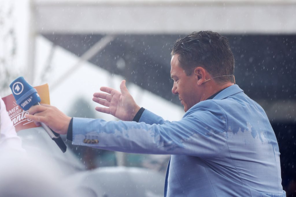 Schon zu Beginn der Sendung nimmt Stefan Mross das Wetter mit Humor und passt sein “Immer wieder sonntags”-Liedchen der feuchtfröhlichen Stimmung an: “Hitze, Regen, Hitze, welche Plage”, singt er genervt. “Wettergott, was stellst du mit uns an? Du bereitest uns verrückte Tage, denn das Wetter fährt gerade Achterbahn!”